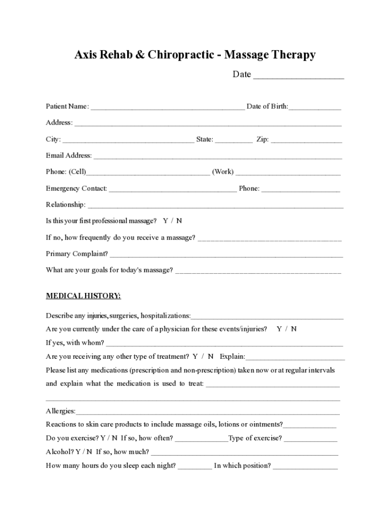 Axis Rehab & Chiropractic Massage Therapy Date ___ Patient Name: ___ Date of Birth:___ Address: ___ City: ___ State: ___ Zip: ___ Email Address: ___ Phone: (Cell)___ (Work) ___ Emergency Contact: