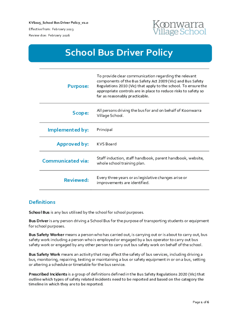 Review due: February 2026School Bus Driver PolicyPurpose:Scope: