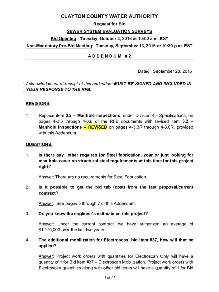 CLAYTON COUNTY WATER AUTHORITY Request for Bid SEWER SYSTEM EVALUATION SURVEYS Bid Opening: Tuesday, October 4, 2016, at 10:00 a.m. EST NonMandatory PreBid Meeting: Tuesday, September 13, 2016, at
