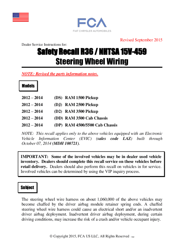 Revised September 2015 Dealer Service Instructions for:Safety Recall R36 / NHTSA 15V459 Steering Wheel Wiring NOTE: Revised the parts' information notes. Models 2012 2014(DS) RAM 1500 Pickup2012 2014(DJ)