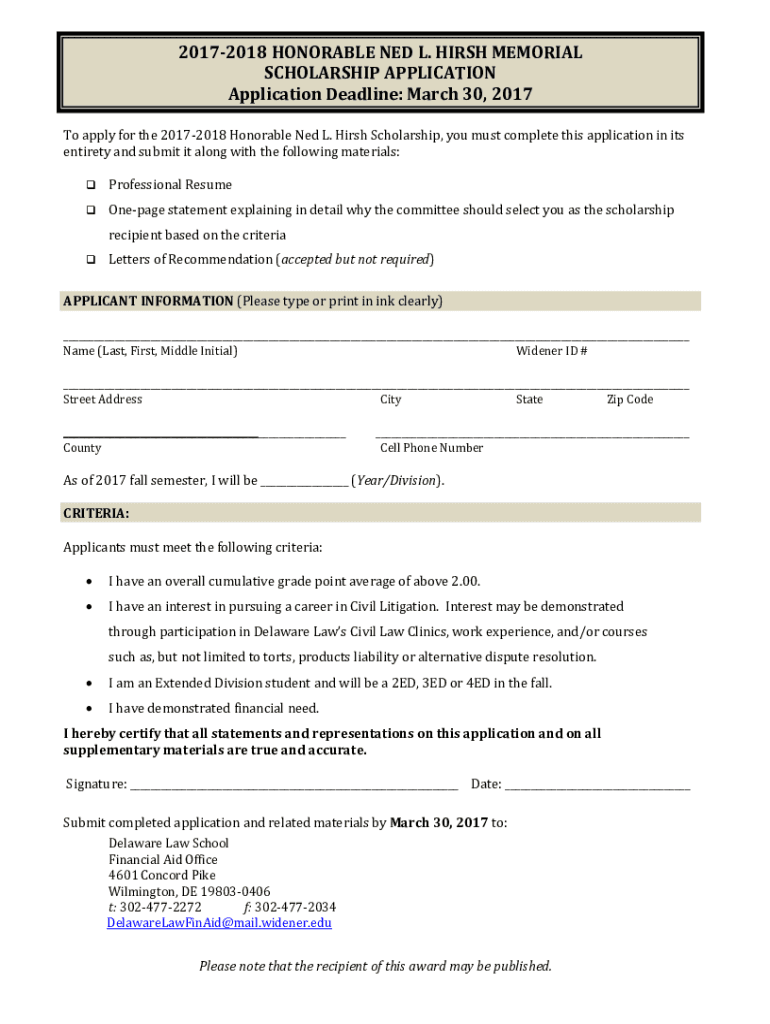 20172018 HONORABLE NED L. HARSH MEMORIAL SCHOLARSHIP APPLICATION Deadline: March 30, 2017, To apply for the 20172018 Honorable Ned L. Harsh Scholarship, you must complete this application in its entirety
