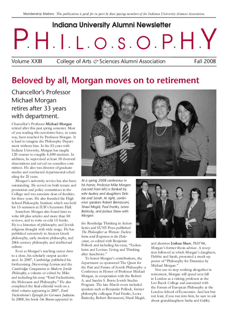 Membership Matters. This publication is paid for in part by due spaying members of the Indiana University Alumni Association. Volume XXIIICollege of Arts & Sciences Alumni AssociationFall 2008Beloved