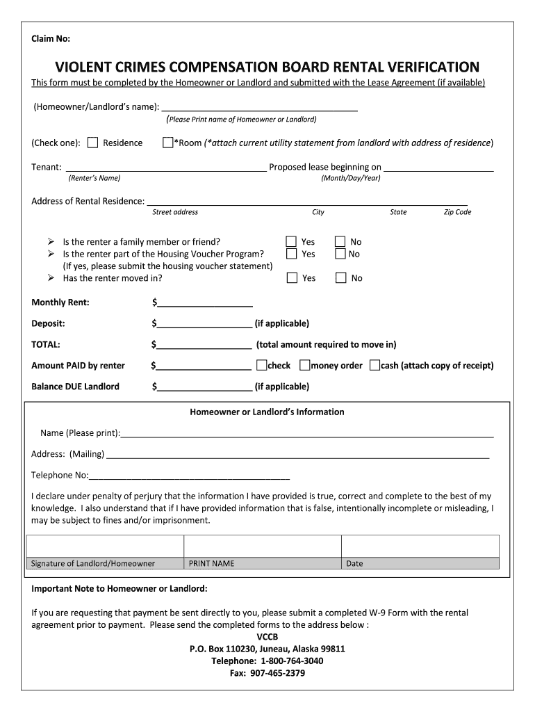 Claim No: VIOLENT CRIMES COMPENSATION BOARD RENTAL VERIFICATION This form must be completed by the Homeowner or Landlord and submitted with the Lease Agreement (if available) (Homeowner/Landlord s