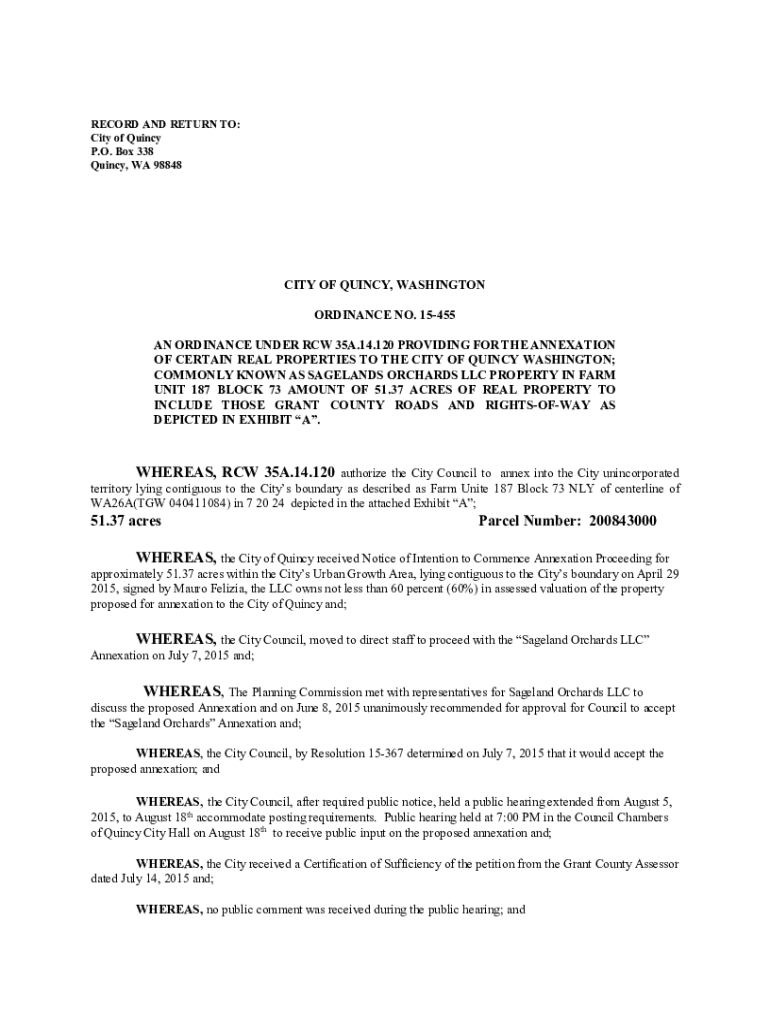 RECORD AND RETURN TO: City of Quincy P.O. Box 338 Quincy, WA 98848CITY OF QUINCY, WASHINGTON ORDINANCE NO. 15455 AN ORDINANCE UNDER RCW 35A.14.120 PROVIDING FOR THE ANNEXATION OF CERTAIN REAL PROPERTIES