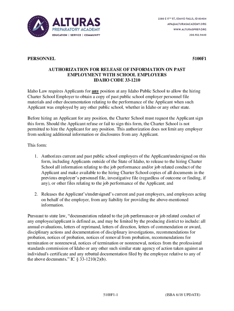 PERSONNEL5100F1AUTHORIZATION FOR RELEASE OF INFORMATION ON PAST EMPLOYMENT WITH SCHOOL EMPLOYERS IDAHO CODE 331210 Idaho Law requires Applicants for any position at any Idaho Public School to allow