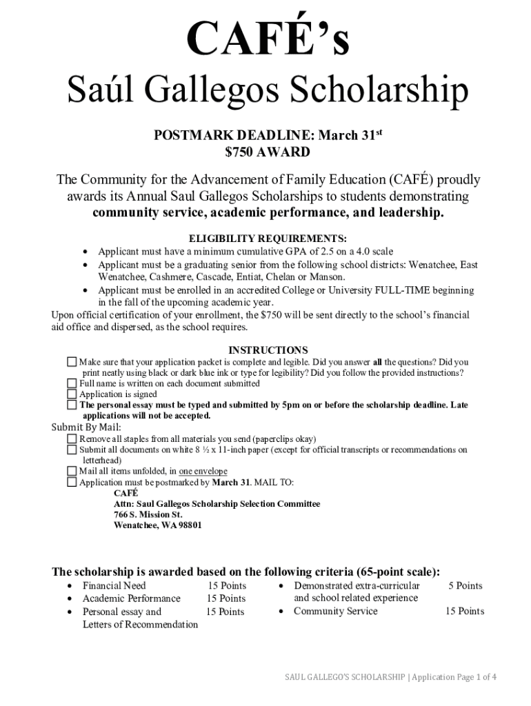 Cars Sal Gallegos Scholarship POSTMARK DEADLINE: March 31st $750 AWARD The Community for the Advancement of Family Education (CAF) proudly awards its Annual Saul Gallegos Scholarships to students