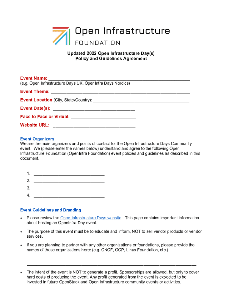 Updated 2022 Open Infrastructure Day(s) Policy and Guidelines AgreementEvent Name: ___ (e.g. Open Infrastructure Days UK, Opening Days Nordics)Event Theme: ___ Event Location (City, State/Country):