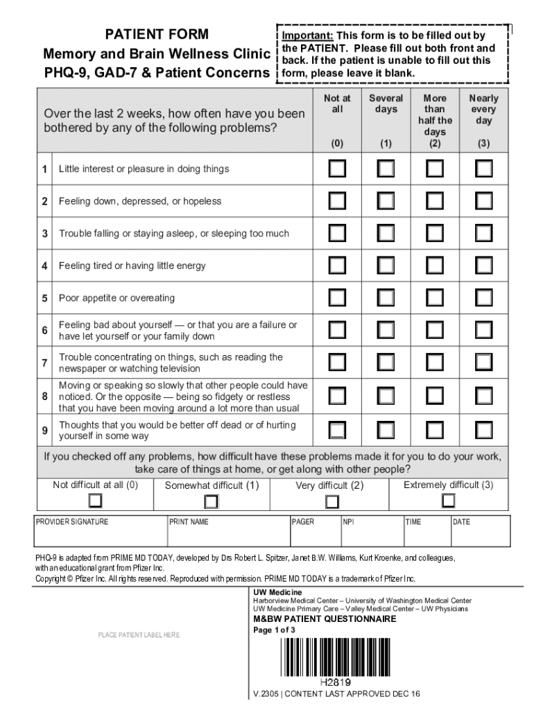 PATIENT FORM Memory and Brain Wellness Clinic PHQ9, GAD7 & Patient ConcernsImportant: This form is to be filled out by the PATIENT. Please fill out both front and back. If the patient is unable to