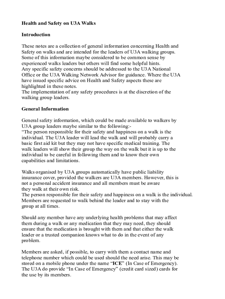 Health and Safety on U3A Walks Introduction These notes are a collection of general information concerning Health and Safety on walks and are intended for the leaders of U3A walking groups. Some of