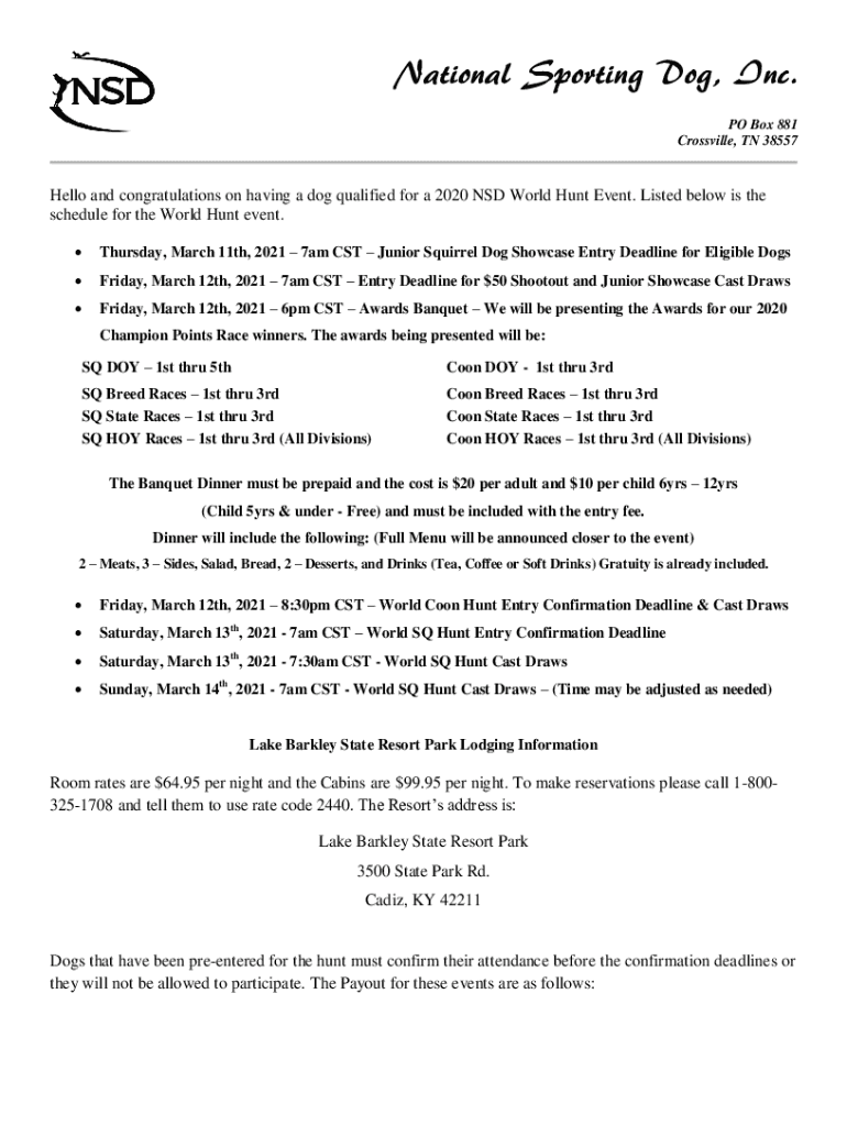 National Sporting Dog, Inc. PO Box 881 Roseville, TN 38557Hello and congratulations on having a dog qualified for a 2020 NSW World Hunt Event. Listed below is the schedule for the World Hunt event.