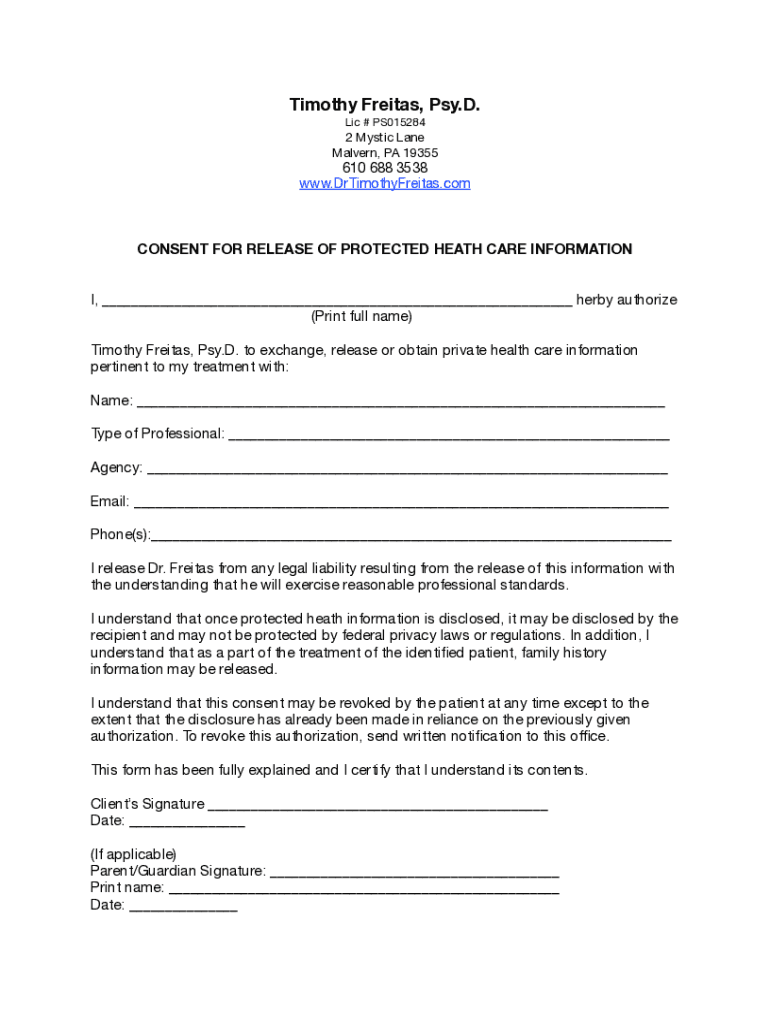 Timothy Fracas, Pay. D. LIC # PS0152842 Mystic LaneMalvern, PA 19355610 688 3538www. DrTimothyFreitas.component FOR RELEASE OF PROTECTED HEATH CARE INFORMATION I, ___ Derby authorize(Print full name)Timothy