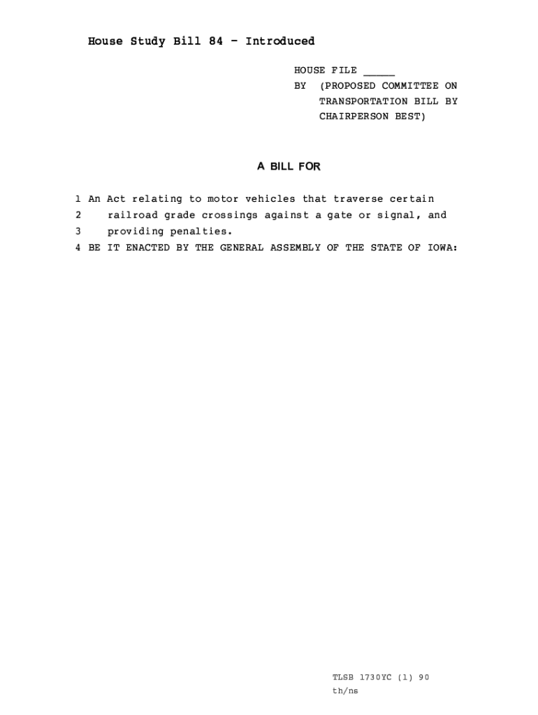 House Study Bill 84 Introduced HOUSE FILE ___ BY (PROPOSED COMMITTEE ON TRANSPORTATION BILL BY CHAIRPERSON BEST)A BILL FOR1 An Act relating to motor vehicles that traverse certain 2 railroad grade
