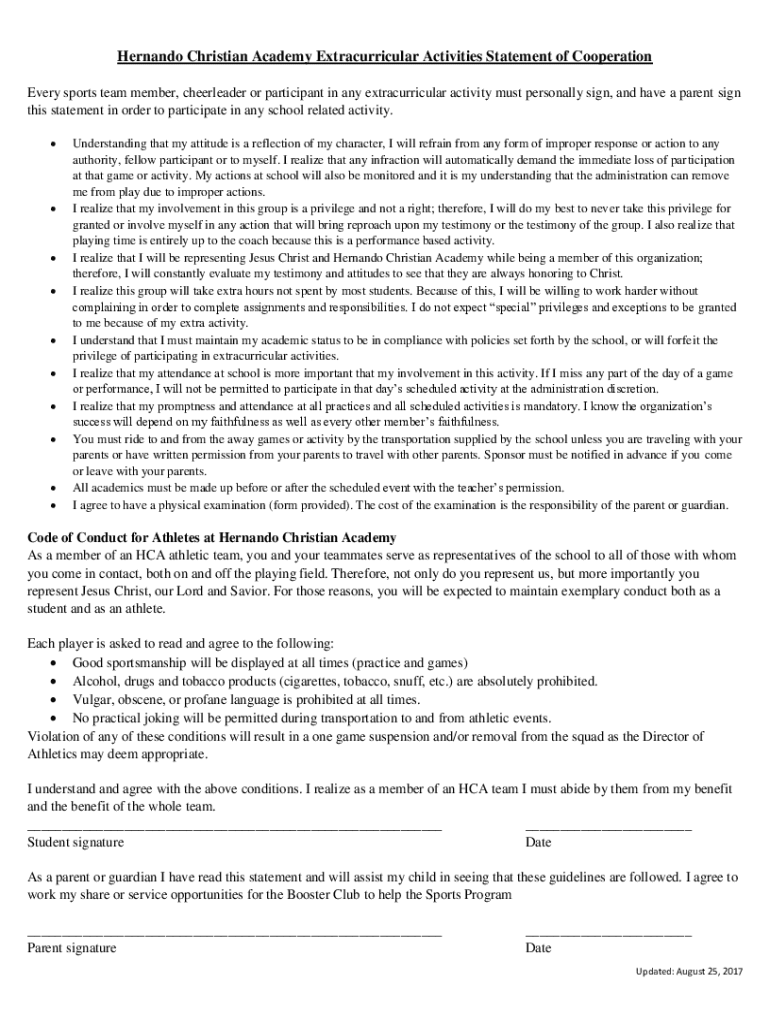 Hernando Christian Academy Extracurricular Activities Statement of Cooperation Every sports team member, cheerleader or participant in any extracurricular activity must personally sign, and have a