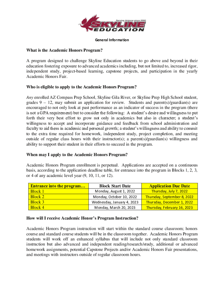 General Informational is the Academic Honors Program? A program designed to challenge Skyline Education students to go above and beyond in their education fostering exposure to advanced academics