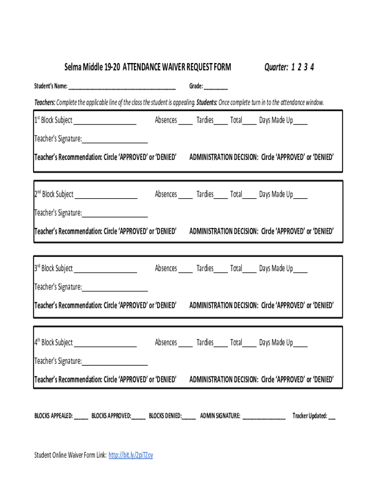 Get the free Selma Middle 19-20 ATTENDANCE WAIVER REQUEST FORM ...