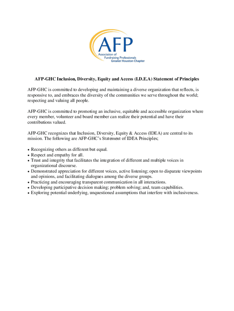 AFPAH Inclusion, Diversity, Equity and Access (I.D.E.A) Statement of Principles AFPAH is committed to developing and maintaining a diverse organization that reflects, is responsive to, and embraces