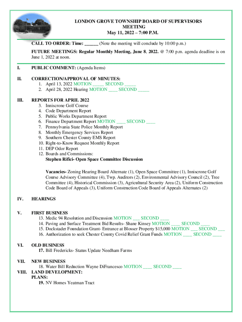 LONDON GROVE TOWNSHIP BOARD OF SUPERVISORS MEETING May 11, 2022 7:00 P.M. CALL TO ORDER: Time: ___ (Note the meeting will conclude by 10:00 p.m.) FUTURE MEETINGS: Regular Monthly Meeting, June 8,