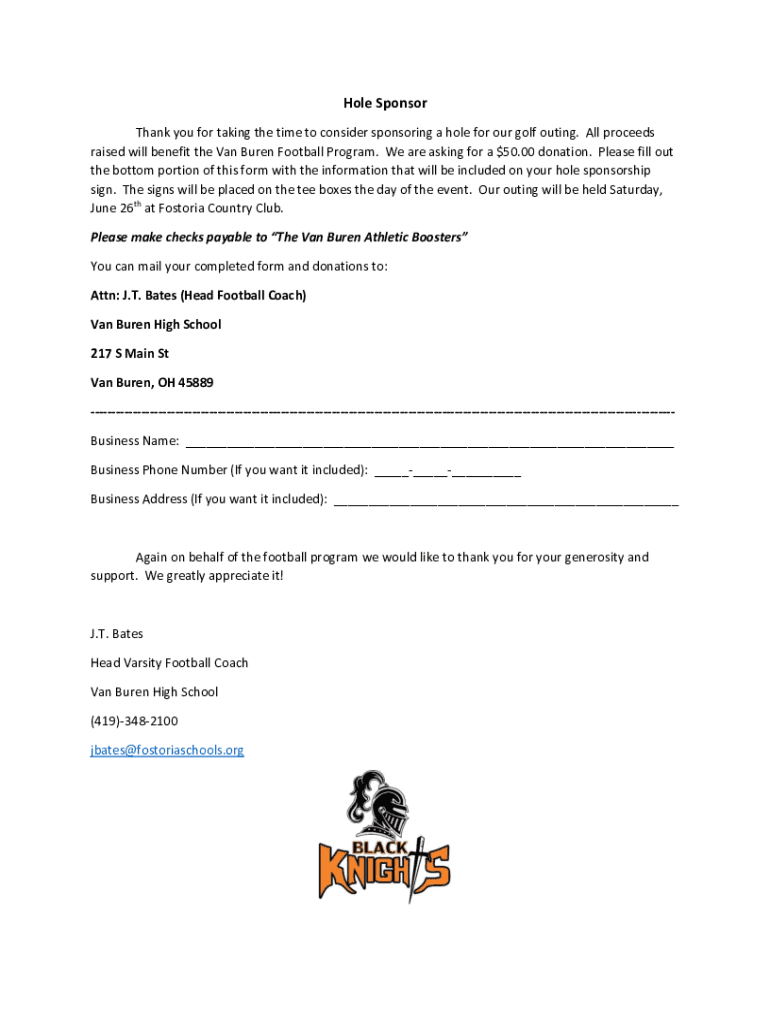Hole Sponsor Thank you for taking the time to consider sponsoring a hole for our golf outing. All proceeds raised will benefit the Van Buren Football Program. We are asking for a $50.00 donation.