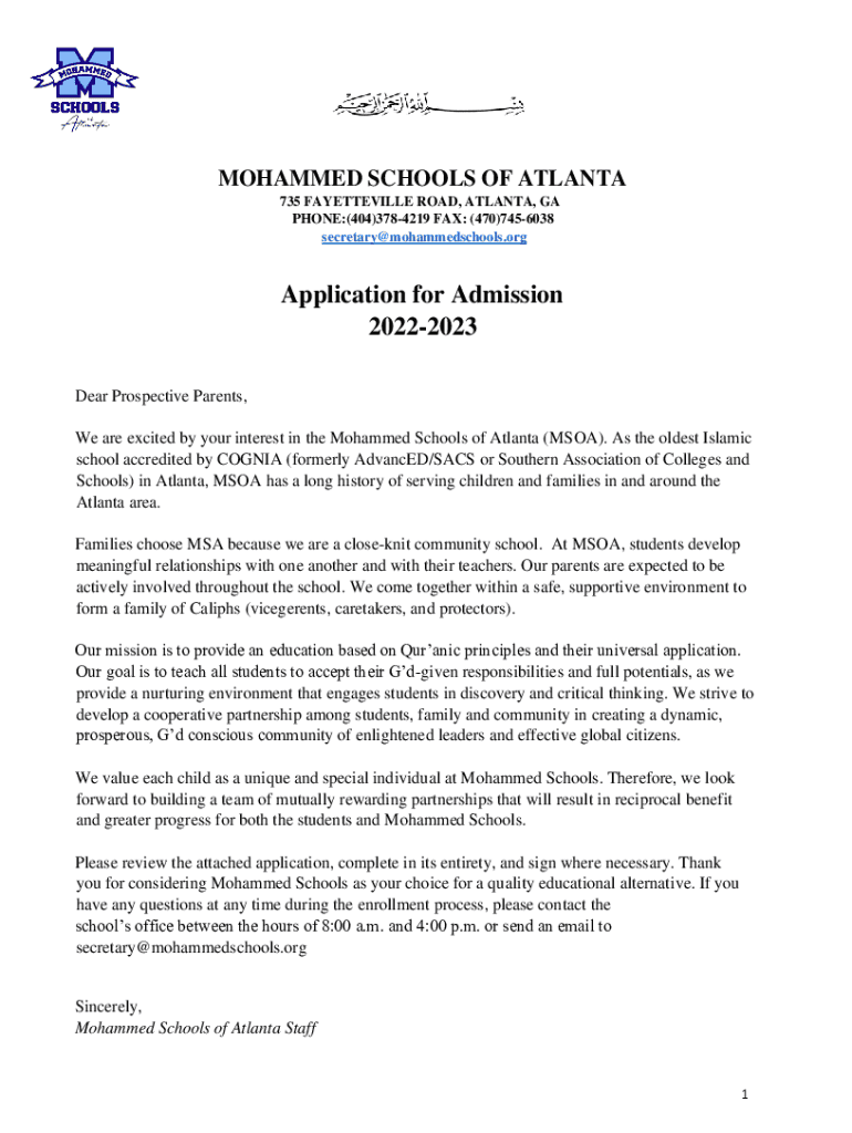 MOHAMMED SCHOOLS OF ATLANTA 735 FAYETTEVILLE ROAD, ATLANTA, GA PHONE:(404)3784219 FAX: (470)7456038 secretary@mohammedschools.orgApplication for Admission 20222023 Dear Prospective Parents, We are