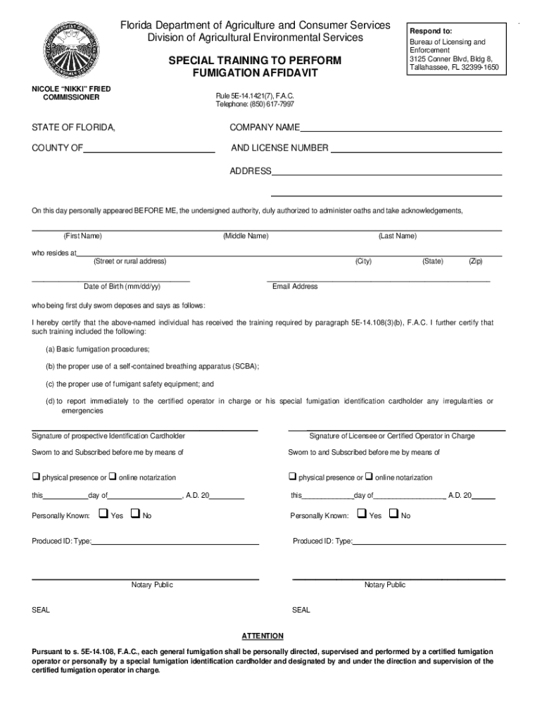 Florida Department of Agriculture and Consumer Services Division of Agricultural Environmental Services SPECIAL TRAINING TO PERFORM FUMIGATION AFFIDAVIT NICOLE NIKKI FRIED COMMISSIONERRespond to: