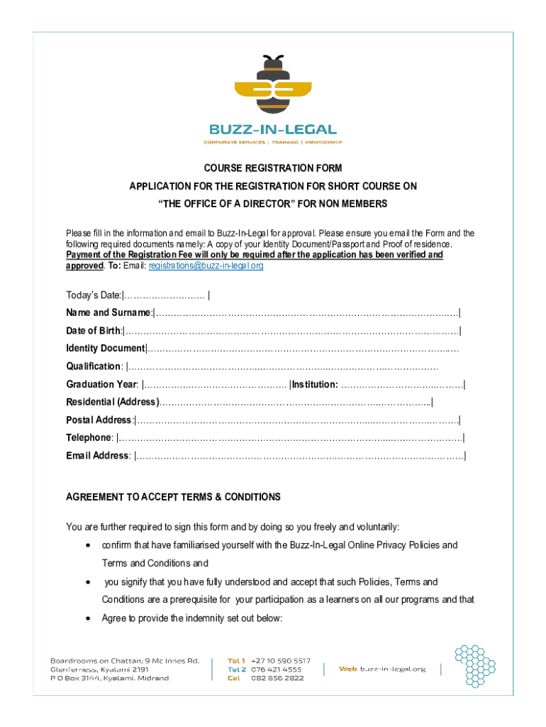 COURSE REGISTRATION FORM APPLICATION FOR THE REGISTRATION FOR SHORT COURSE ON THE OFFICE OF A DIRECTOR FOR NON MEMBERS Please fill in the information and email to BuzzInLegal for approval. Please
