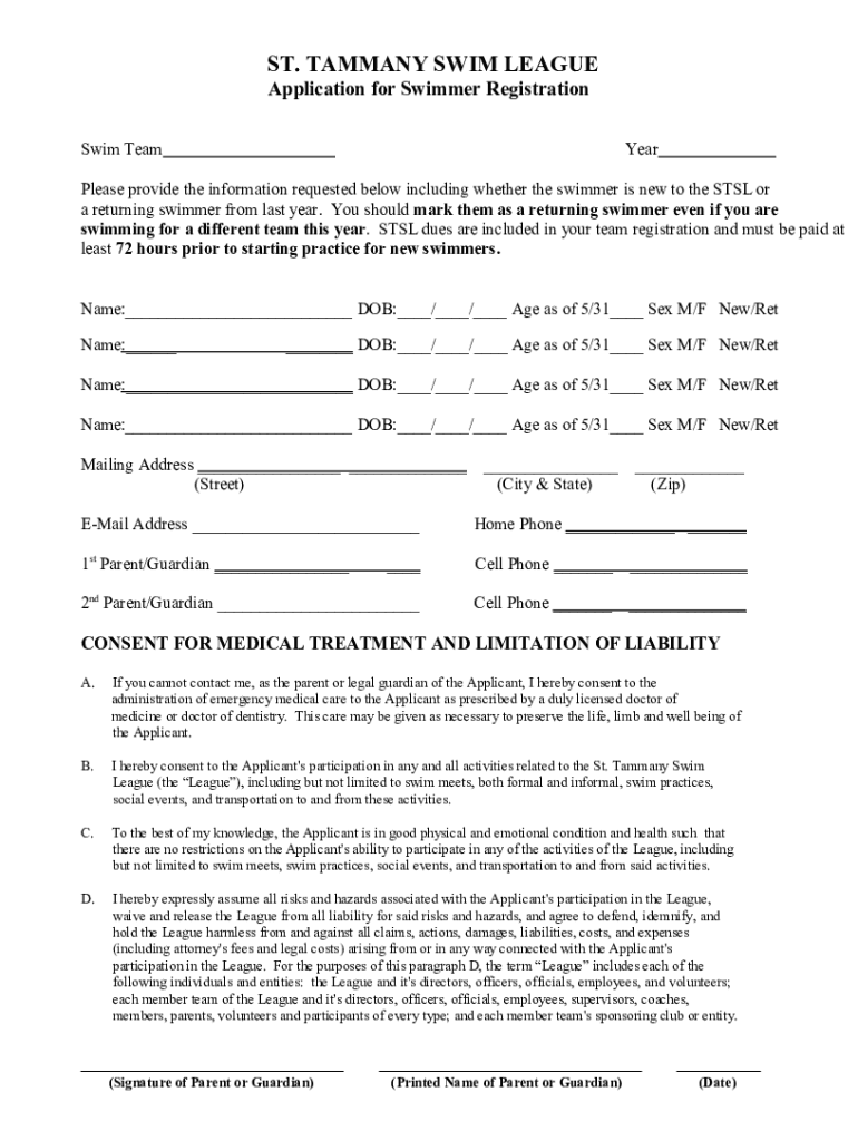 ST. TAMMANY SWIM LEAGUE Application for Swimmer Registration Swim TeamYearPlease provide the information requested below including whether the swimmer is new to the SSL or a returning swimmer from