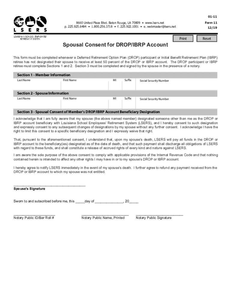 0111 Form 118660 United Plaza Blvd. Baton Rouge, LA 70809 www.lsers.net p. 225.925.6484 1.800.256.3718 f. 225.922.1001 e. webmaster@lsers.net12/19PrintResetSpousal Consent for DROP/IBP Account This