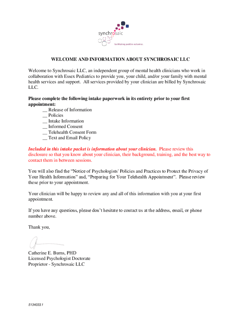 WELCOME AND INFORMATION ABOUT SYNCHROS LLC Welcome to Synchros LLC, an independent group of mental health clinicians who work in collaboration with Essex Pediatrics to provide you, your child, and/or