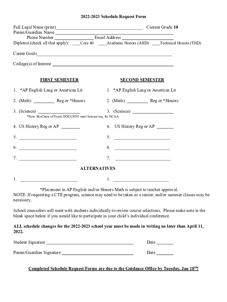 20222023 Schedule Request Form Full Legal Name (print)___ Current Grade 10 Parent/Guardian Name Phone Number Email Address Diploma (check all that apply): ___Core 40 ___Academic Honors (AHD) ___Technical
