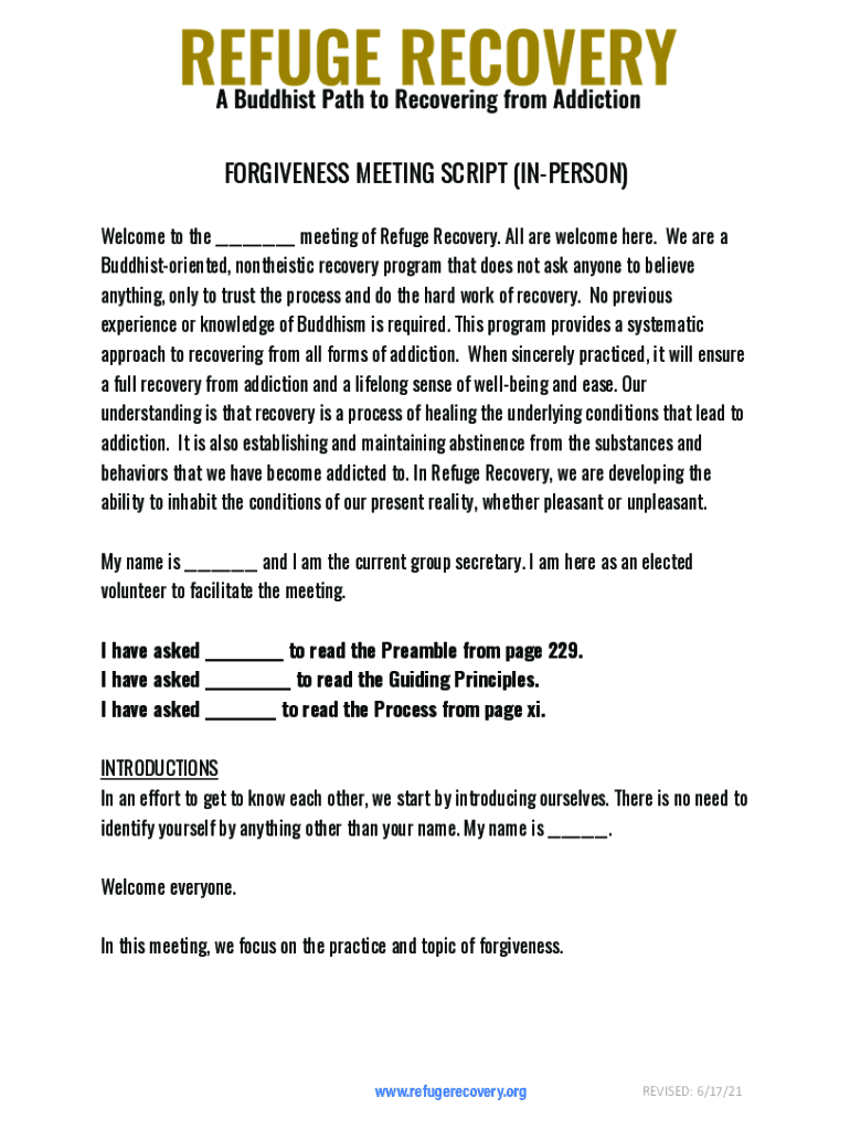 Welcome to the ___ meeting of Refuge Recovery. All are welcome here. We are a