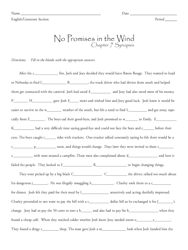 Name English/Literature SectionDatePeriodNo Promises in the Wind Chapter 7 SynopsisDirections:Fill in the blanks with the appropriate answers. After the c___ fire, Josh and Joey decided they would