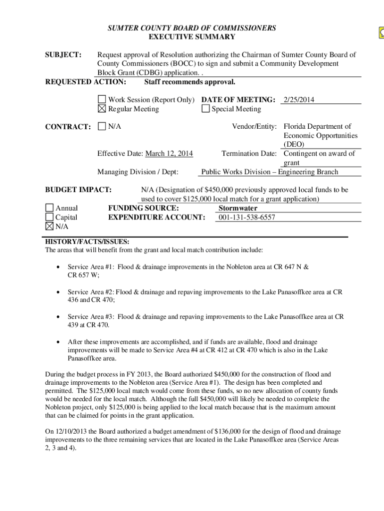 SUMTER COUNTY BOARD OF COMMISSIONERS EXECUTIVE SUMMARY Request approval of Resolution authorizing the Chairman of Sumter County Board of County Commissioners (BOCK) to sign and submit a Community