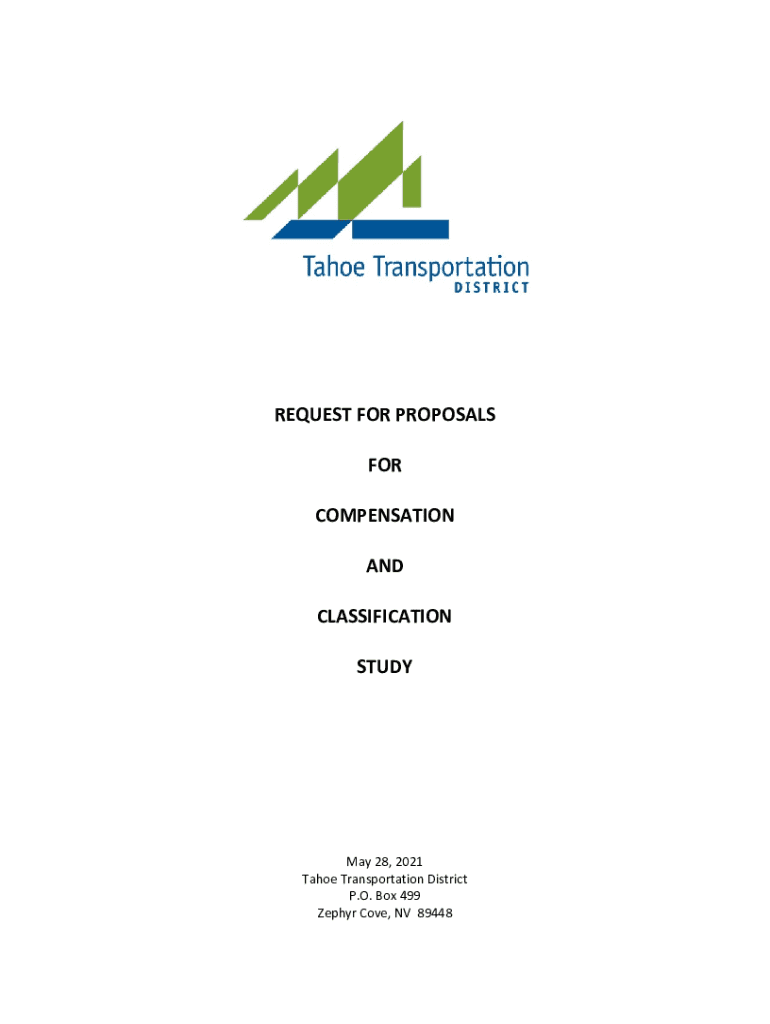 REQUEST FOR PROPOSALS FOR COMPENSATION AND CLASSIFICATION STUDY May 28, 2021, Tahoe Transportation District P.O. Box 499 Zephyr Cove, NV 89448SECTION 1 PROCUREMENT SCHEDULE The Tahoe Transportation