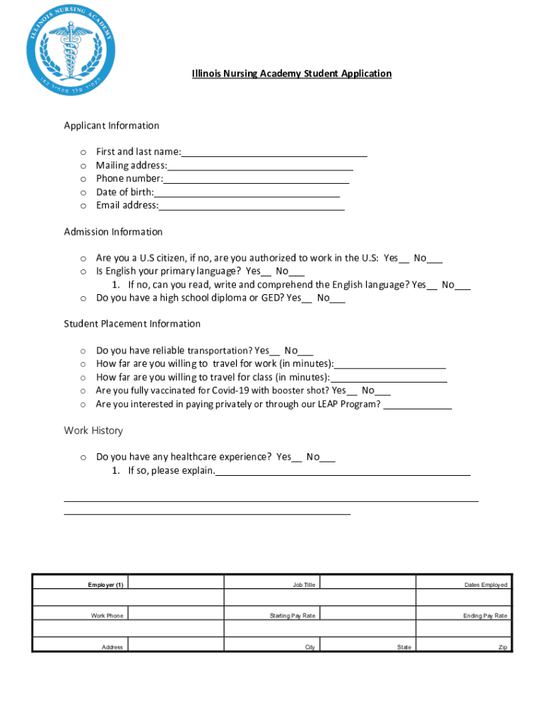 Illinois Nursing Academy Student ApplicationApplicant Information o o o o first and last name:___ Mailing address:___ Phone number:___ Date of birth:___ Email address:___Admission Information o Are