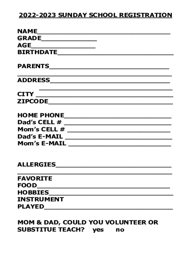 20222023 SUNDAY SCHOOL REGISTRATION NAME___ GRADE___ AGE___ BIRTHDATE___ PARENTS___ ___ ADDRESS___ ___ CITY ___ OPCODE___ HOME PHONE___ Dads CELL # ___ Moms CELL # ___ Dads EMAIL ___ Moms EMAIL ___