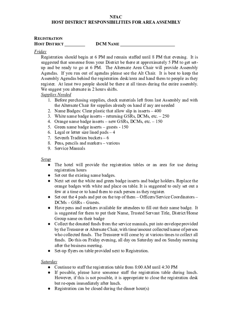 NFC HOST DISTRICT RESPONSIBILITIES FOR AREA ASSEMBLY REGISTRATION HOST DISTRICT ___DCM NAME ___Friday Registration should begin at 6 PM and remain staffed until 8 PM that evening. It is suggested