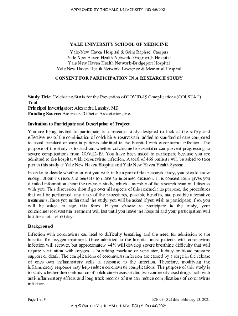 APPROVED BY THE YALE UNIVERSITY IRB 4/6/2021YALE UNIVERSITY SCHOOL OF MEDICINE