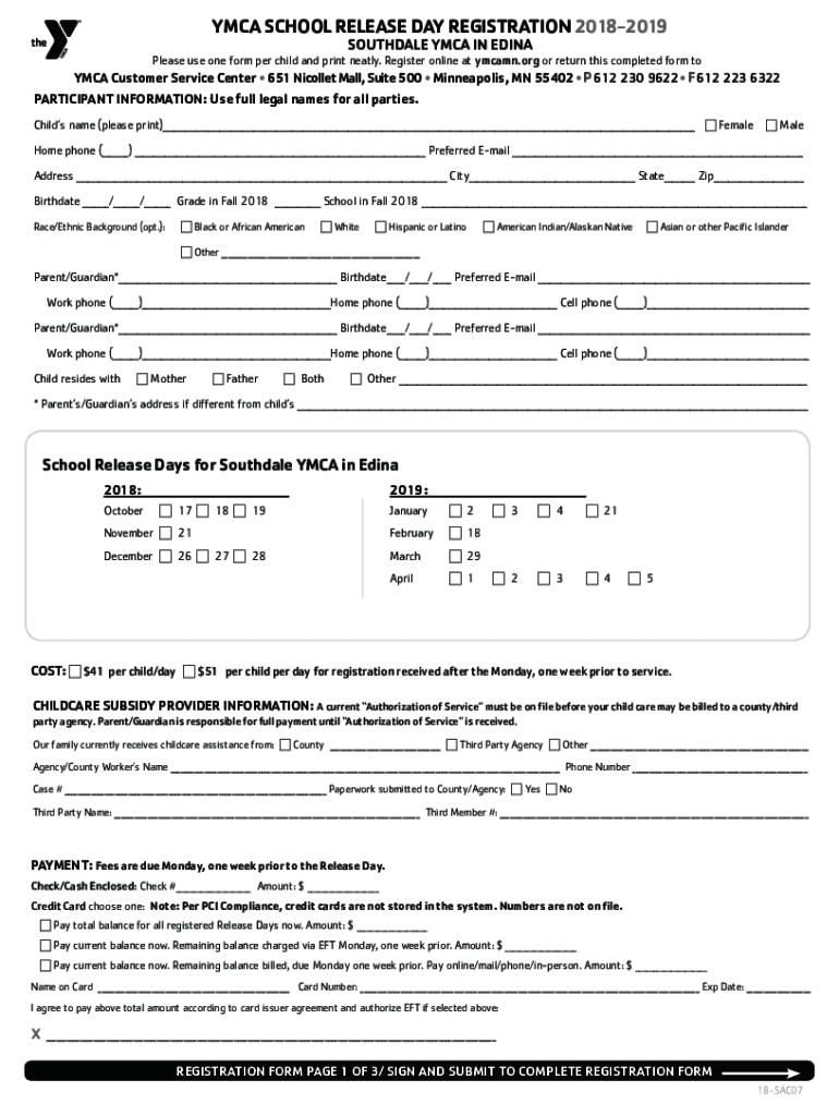 YMCA SCHOOL RELEASE DAY REGISTRATION 20182019