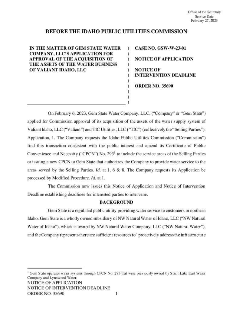 Office of the Secretary Service Date February 27, 2023BEFORE THE IDAHO PUBLIC UTILITIES COMMISSION IN THE MATTER OF GEM STATE WATER COMPANY, LCS APPLICATION FOR APPROVAL OF THE ACQUISITION OF THE