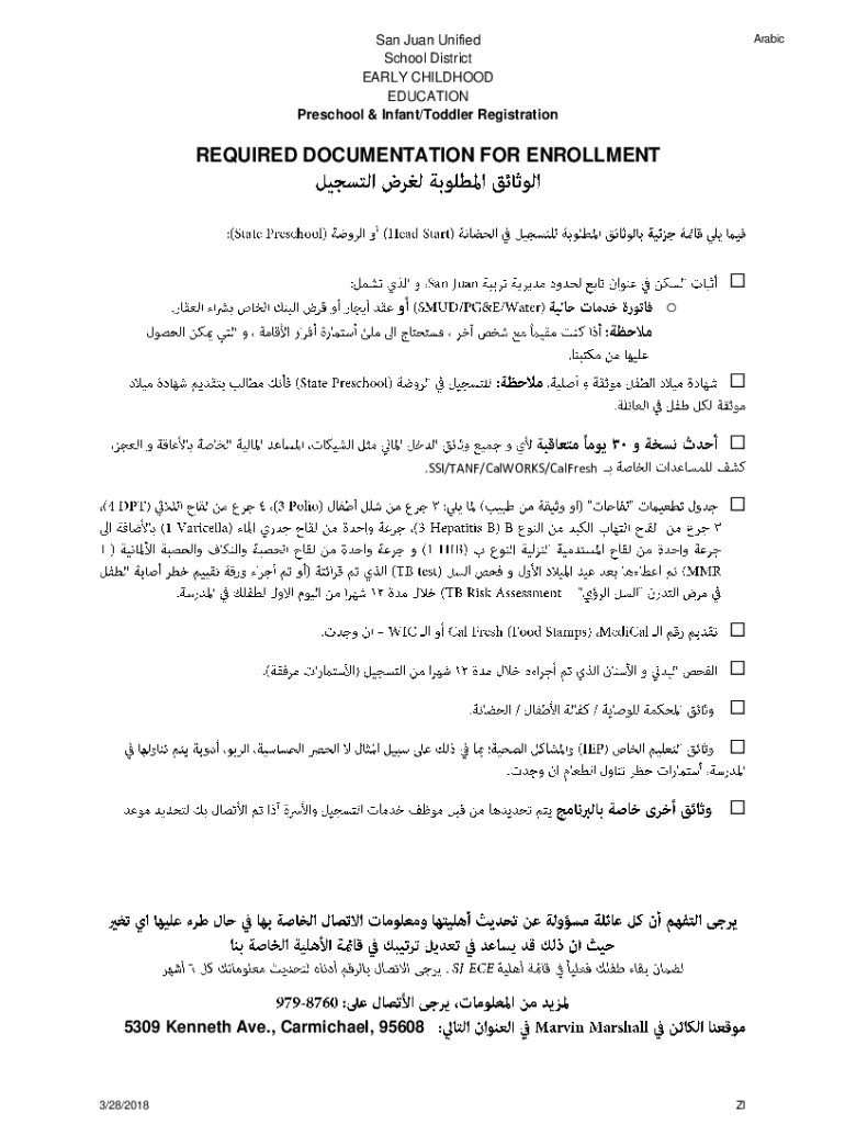 San Juan Unified School District EARLY CHILDHOOD EDUCATION Preschool & Infant/Toddler RegistrationArabicREQUIRED DOCUMENTATION FOR ENROLLMENT o .SSI/TANK/Gasworks/Afresh 5309 Kenneth Ave., Carmichael,