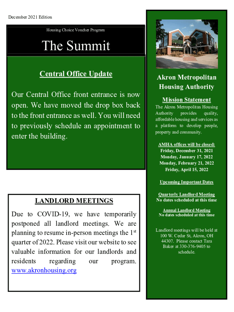 December 2021 Edition Housing Choice Voucher Program Summit RTA Errors and How They Affect You Central Office Update Our Central Office front entrance is now open. We have moved the drop box back