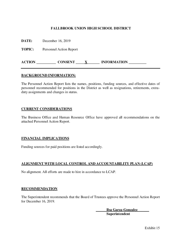 FALLBROOK UNION HIGH SCHOOL DISTRICTDATE:December 16, 2019TOPIC:Personnel Action Deportation ___ CONSENT ___X___ INFORMATION ___BACKGROUND INFORMATION: The Personnel Action Report lists the names,