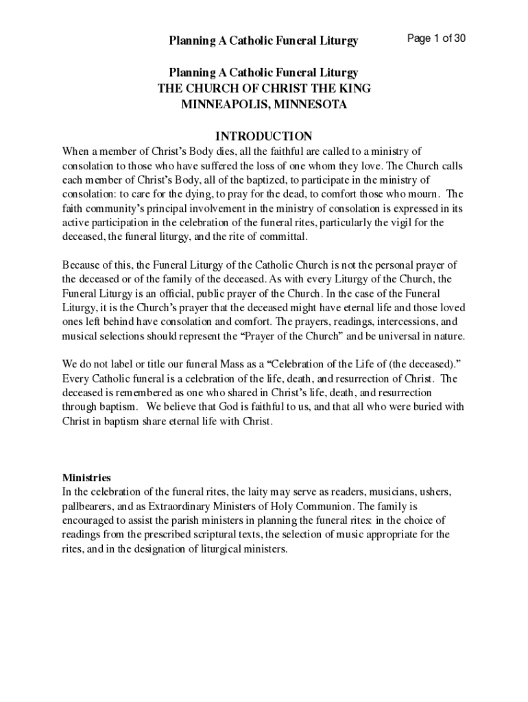 Planning A Catholic Funeral Liturgy Page 1 of 30Planning A Catholic Funeral Liturgy THE CHURCH OF CHRIST THE KING MINNEAPOLIS, MINNESOTA INTRODUCTION When a member of Christs Body dies, all the faithful