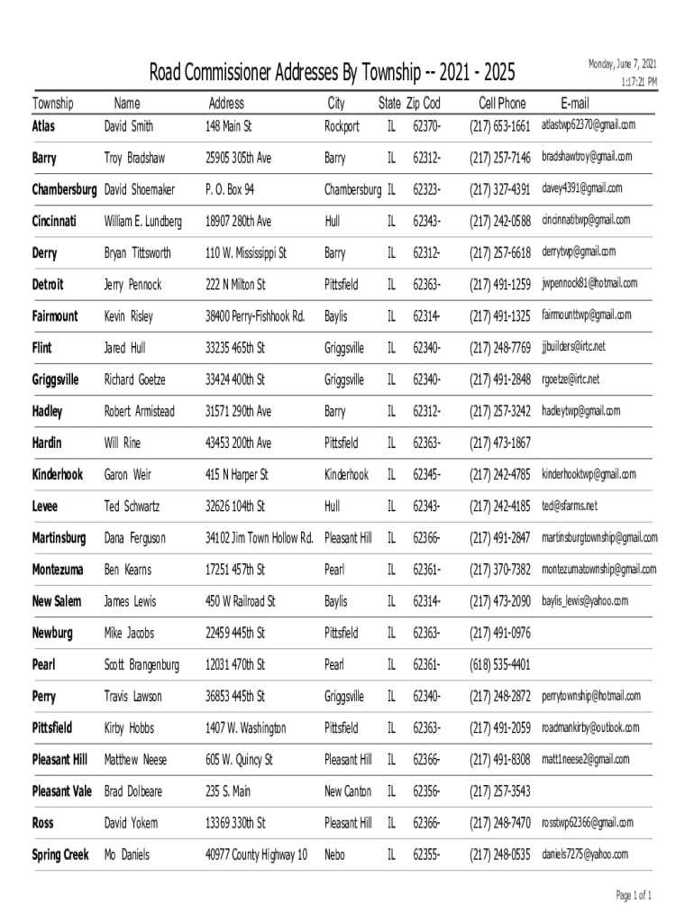 TownshipCityState Zip Cornell Phone Monday, June 7, 2021