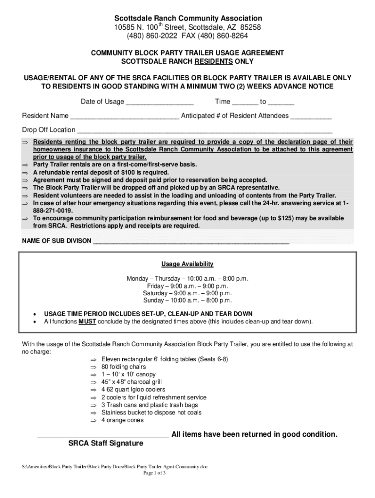 Scottsdale Ranch Community Association 10585 N. 100th Street, Scottsdale, AZ 85258 (480) 8602022 FAX (480) 8608264 COMMUNITY BLOCK PARTY TRAILER USAGE AGREEMENT SCOTTSDALE RANCH RESIDENTS ONLY USAGE/RENTAL