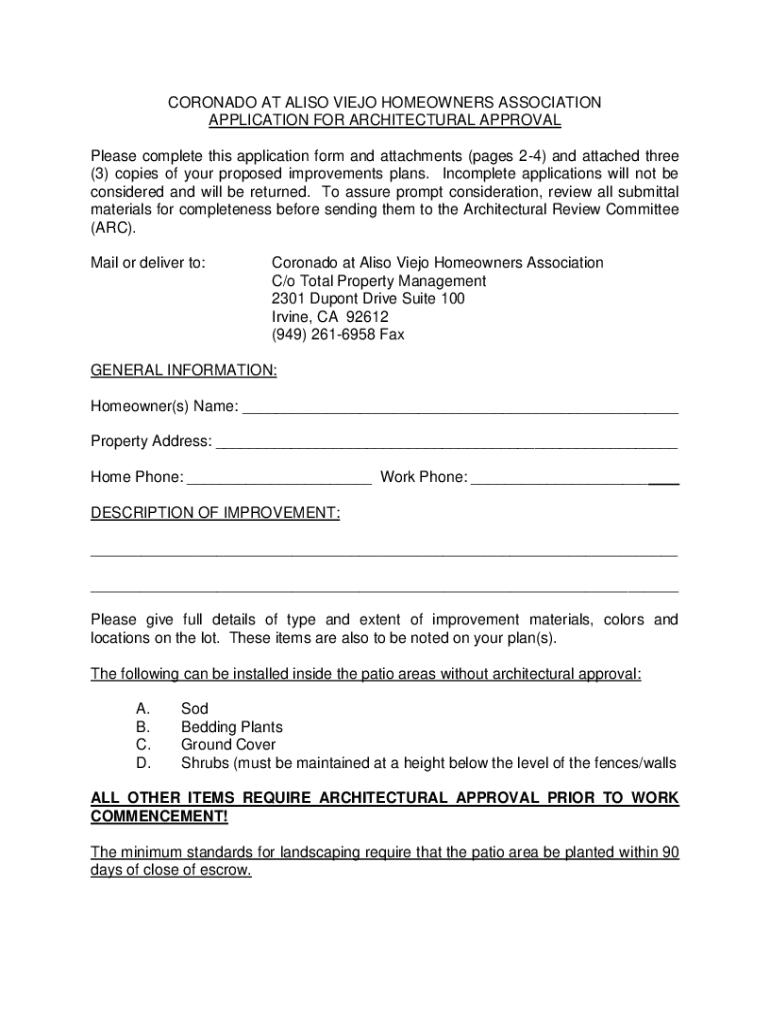 CORONADO AT ALSO VIE JO HOMEOWNERS ASSOCIATION APPLICATION FOR ARCHITECTURAL APPROVAL Please complete this application form and attachments (pages 24) and attached three (3) copies of your proposed