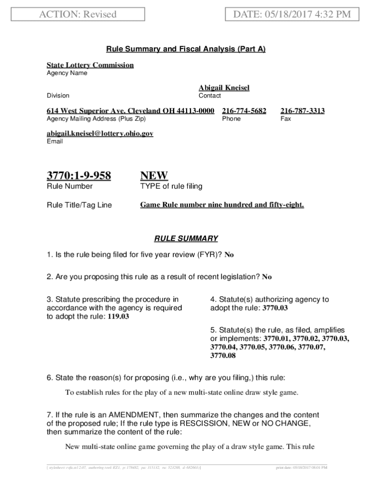 ACTION: RevisedDATE: 05/18/2017 4:32 Rule Summary and Fiscal Analysis (Part A) State Lottery Commission Agency Name Abigail Neal DivisionContact614 West Superior Ave. Cleveland OH 441130000 21677456822167873313Agency