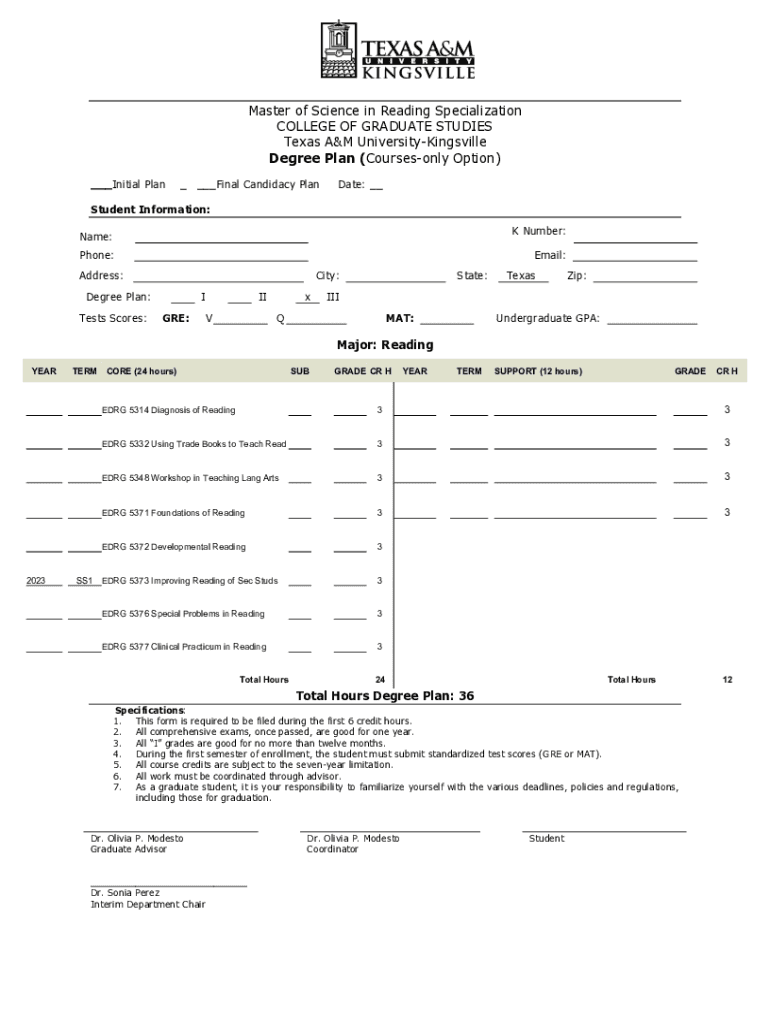 Get the free BLANK DEGREE PLAN-MS in Reading Specialization Degree Plan Courses-only Option.doc