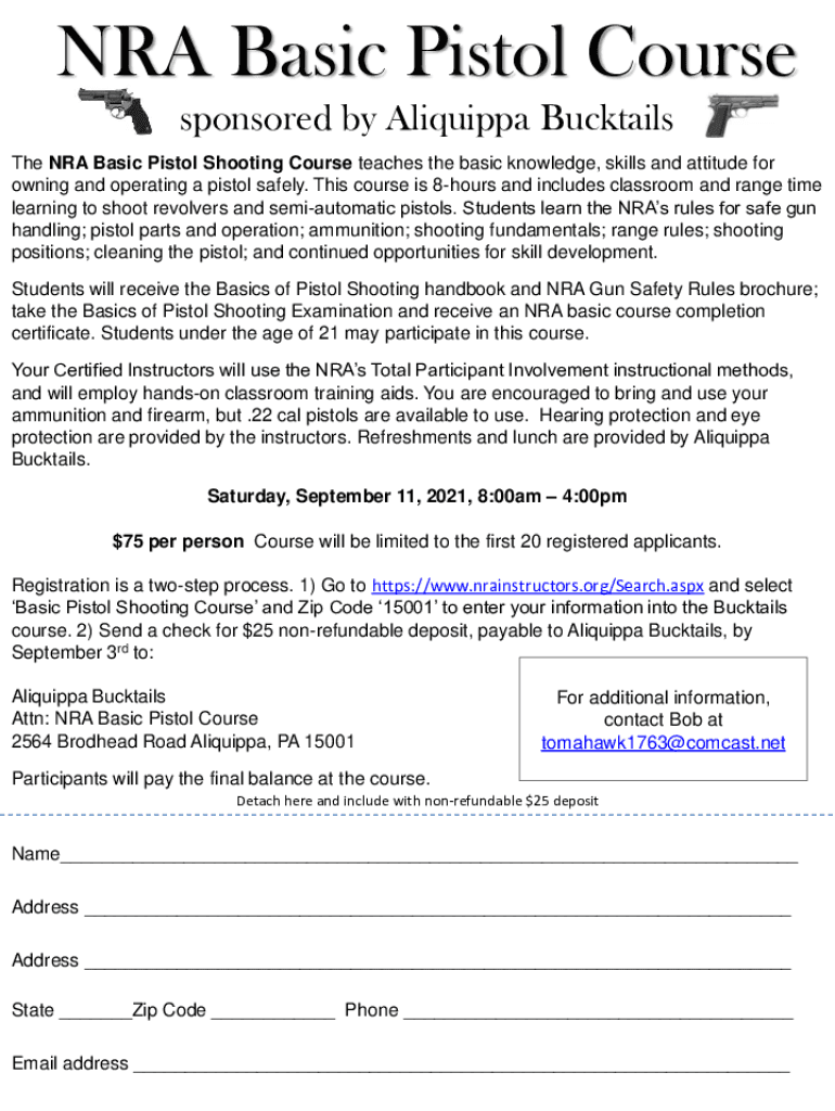 NRA Basic Pistol Course sponsored by Arequipa Buck tails The NRA Basic Pistol Shooting Course teaches the basic knowledge, skills and attitude for owning and operating a pistol safely. This course