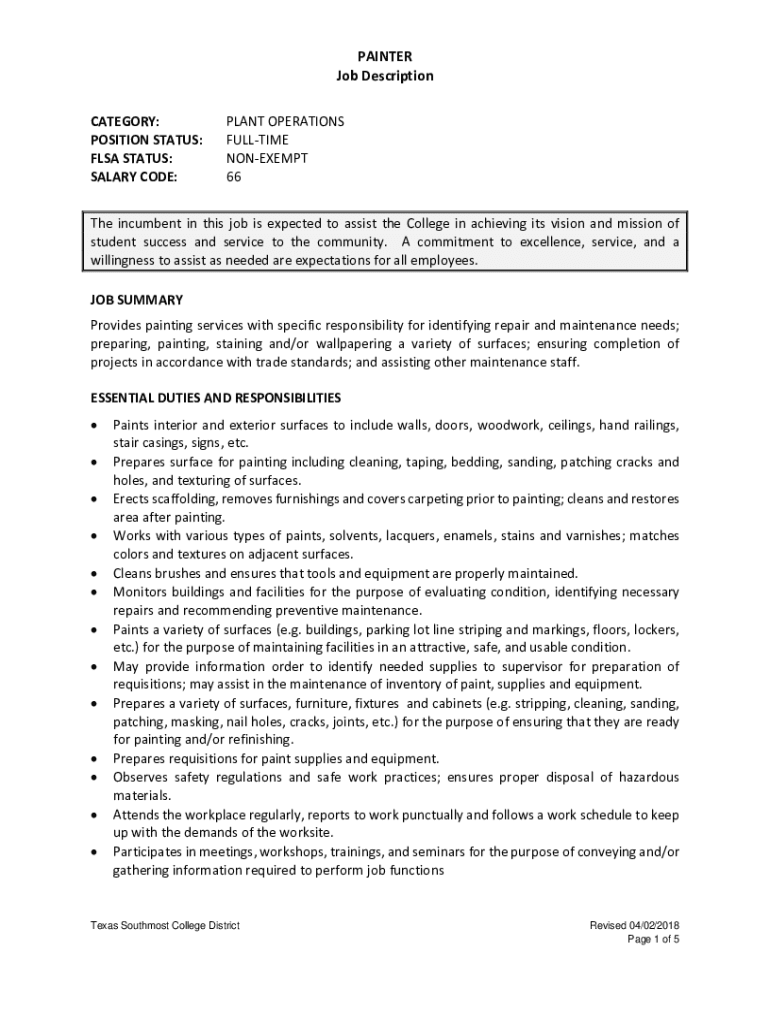 PAINTER Job Description CATEGORY: POSITION STATUS: FLEA STATUS: SALARY CODE:PLANT OPERATIONS FULL TIME NONEXEMPT 66The incumbent in this job is expected to assist the College in achieving its vision
